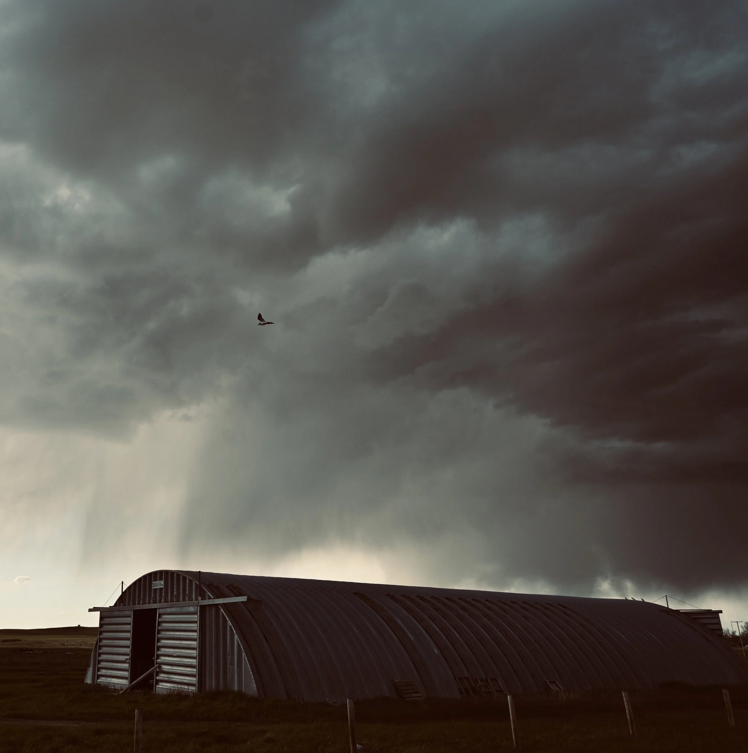 Hawk circling over quonset, storm building, Val Marie, Saskatchewan